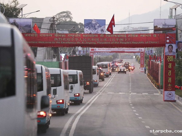 10月12日,尼泊尔首都加德满都,车队经过一道道迎宾拱门。新华社记者丁林摄