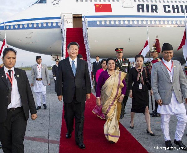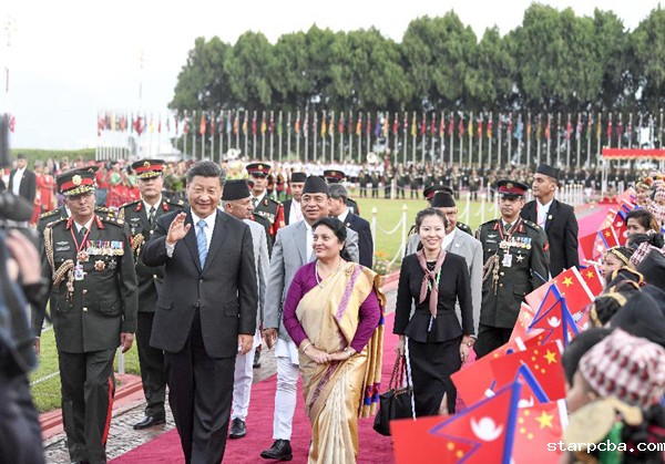 10月12日,国家主席习近平乘专机抵达加德满都,开始对尼泊尔进行国事访问。尼泊尔总统班达里在机场为习近平举行具有浓郁尼泊尔民族特色的欢迎仪式。新华社记者高洁摄