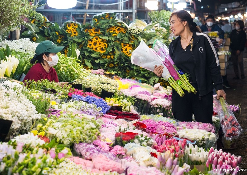 2025年3月28日,一名女子在越南河内广霸花市购买鲜花。新华社记者 朱炜 摄