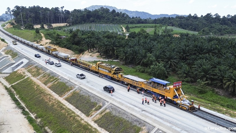 这是2024年5月6日在马来西亚彭亨州航拍的马东铁项目的铺轨现场。新华社记者 程一恒 摄