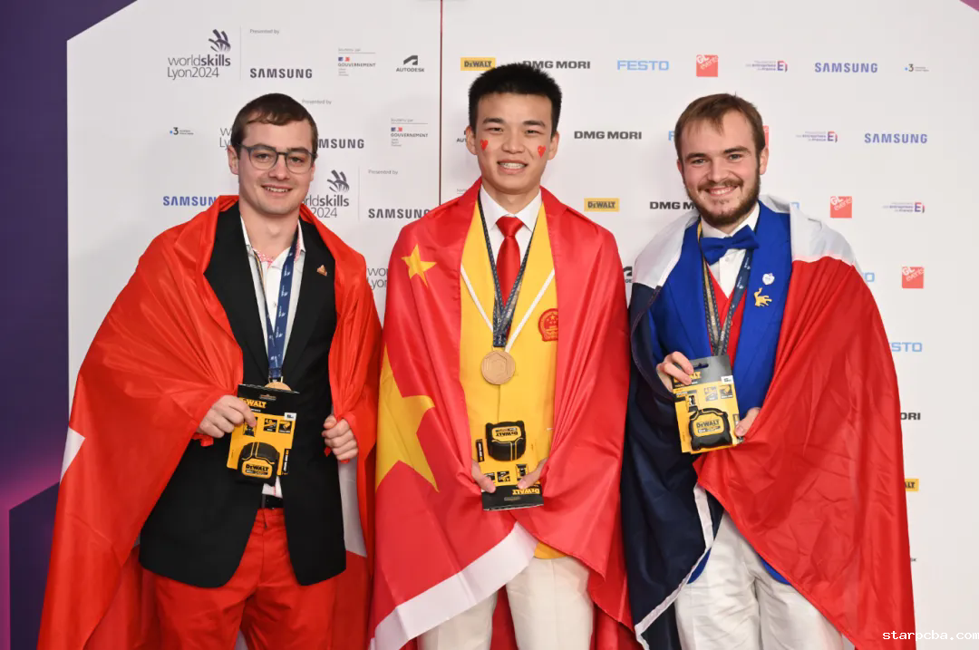 第47届世界技能大赛上,熊首钰(中)摘得抹灰与隔墙系统项目金牌。 图片来源:世界技能大赛官网