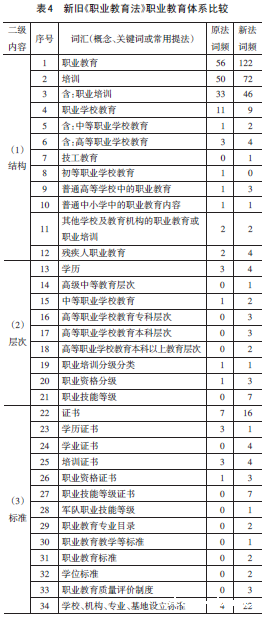 新《职业教育法》、原《职业教育法》都将“职业教育体系”单列一章并放在第二章,体现出职业教育体系建设的重要性。从结构、层次、标准、规则、布局等五个方面来认识新《职业教育法》建构的职业教育体系,共收集相关词汇59个,其中新词汇30个,占51%(表4),反映了职业教育体系的现代性、包容性、系统性、适应性特点。