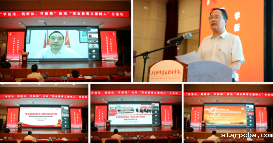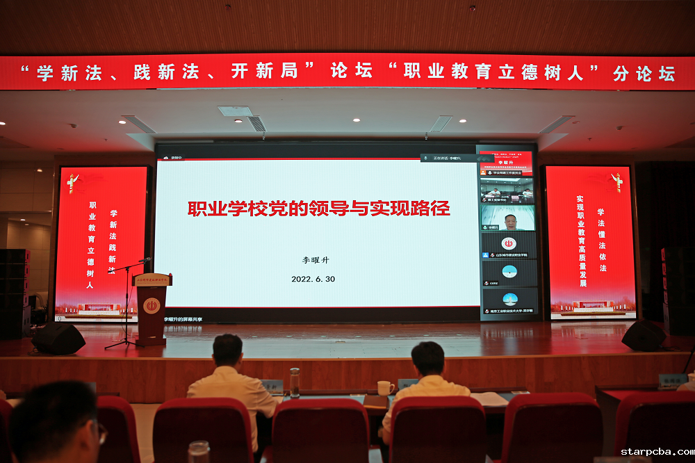 学会会长、教育部原副部长鲁昕,山东省教育厅党组成员、副厅长邢顺峰,学会党建工作委员会主任李曜升、德育工作委员会主任刘宝民,学会党建工作委员会执行主任、山东城市建设职业学院党委书记花景新等领导专家出席。分论坛由刘宝民主持。来自全国职业院校的党委书记、党员代表,学会党建工作委员会和德育工作委员会会员单位代表齐聚云端,深刻领悟修法精神,准确把握修法内容,共襄推动职业教育高质量发展。山东城市建设职业学院学校党委领导班子成员、副科级以上干部、专业负责人、专任教师等200余人在现场参会。南京工业职业技术大学、山东城市建设职业学院、长沙民政职业技术学院、新疆农业职业技术学院 、北京市商业学校等5所院校在会上做了经验交流。