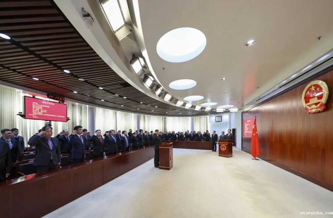 宣誓现场,国徽高悬、国旗鲜艳,宣誓台上摆放着《中华人民共和国宪法》,气氛庄严而隆重。下午2时15分,宣誓仪式开始,全体起立,齐声高唱中华人民共和国国歌。随后,领誓人手抚宪法,右手举拳领诵誓词。其他宣誓人列队站立,右手举拳跟诵誓词。